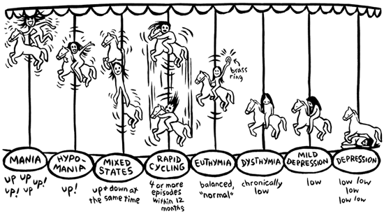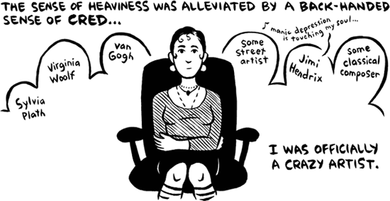 I learned something huge from putting my story out in the world: as I’d hoped, people told me I was giving them company, but I was given so much company, too. I was not a weirdo bipolar cartoonist specimen. Strangers, friends, readers, even interviewers would more often than not (I mean that) disclose their own personal experience with mental illness: their own diagnosis, their family history, their friend’s suicide, their son’s struggle. I didn’t know—couldn’t have known—how many chords my story could strike, or how many people were ready to be given an opportunity to come out.
