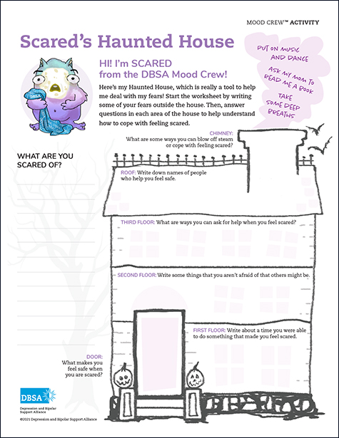 “EEK! …Oh. You startled me! I’m Scared from the DBSA Mood Crew… I don’t know about you, but when I’m feeling scared, I like to hide in my house… under my bed if possible. I know a lot of my friends feel scared sometimes, so I created this activity to help kids know what to do when they feel frightened, too.“