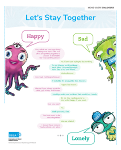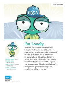 Lonely is feeling less isolated since being invited to join the DBSA Mood Crew®. Lonely tends to spend a great deal of time by himself and is interested in seeing where this will go. Lonely’s father, Solitude, told Lonely that joining the DBSA Mood Crew would be a good way to make new friends. Lonely hasn’t always been great at that but will give it a try.