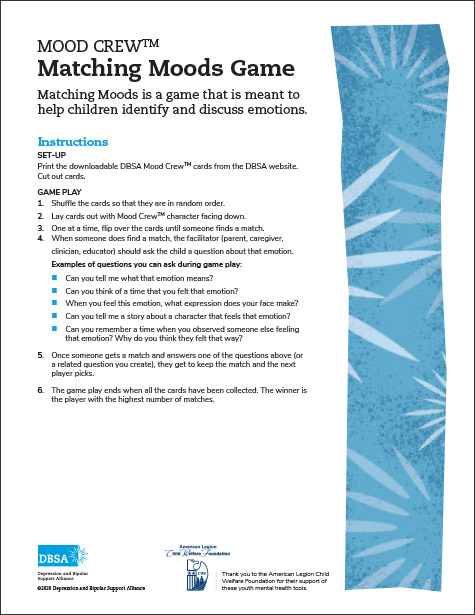 Matching Moods is a game that is meant to help children identify and discuss emotions. Similar to the classic game Memory, this game adds conversation prompts to better understand emotions.