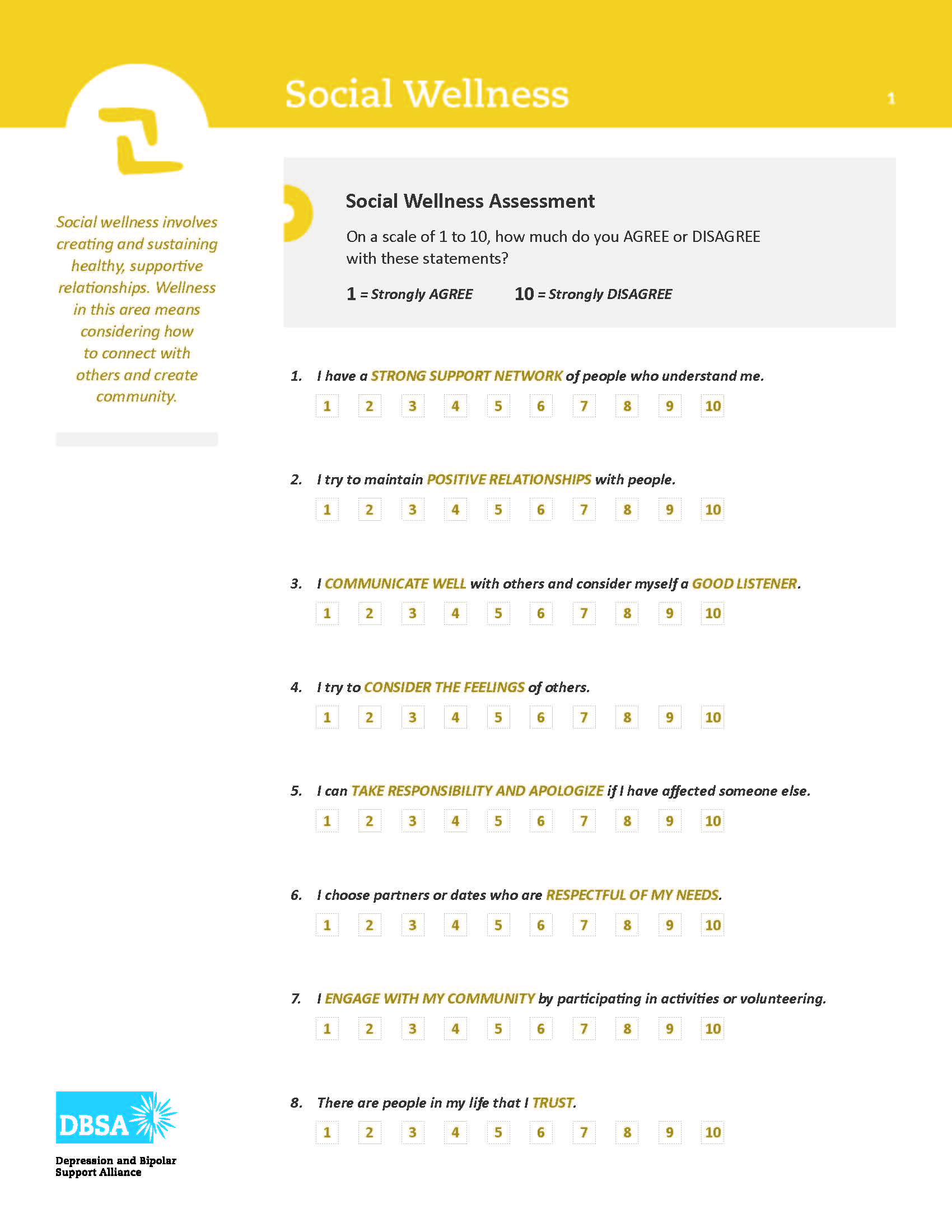 Connecting with others is an important part of your overall well-being, yet you may find it’s no easy task. Social wellness describes the quality of relationships you have with other people and how you connect with your community. When you live with depression or bipolar disorder, building and keeping relationships can be challenging. The DBSA Wellness Wheel can help you think through ways to create relationships that are healthy and nurturing.