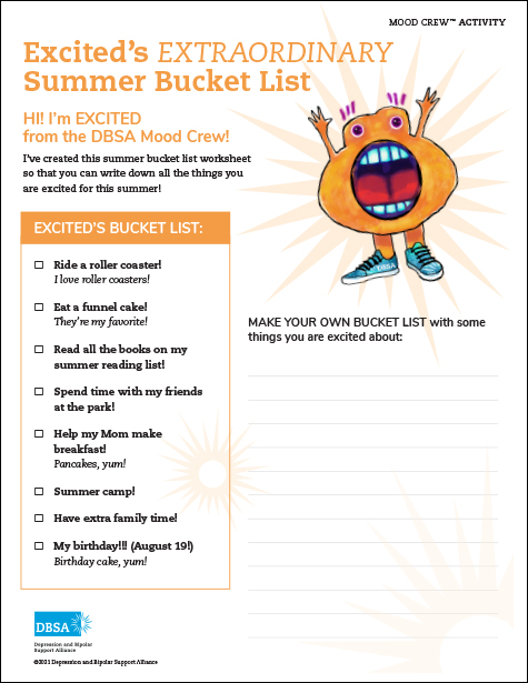 “HELLLOOOO!!! I’m Excited from the DBSA Mood Crew™! I am feeling very energetic because it is finally my time to share a fun new activity with you! Summer is one of my favorite times of year. One, because of funnel cakes, and two, because I have more time to have fun with my friends and family! I’m looking forward to doing so many things this summer that I needed to write them all down on my summer bucket list! Want to create a summer bucket list with me? I’ve created a new worksheet to do just that. Check it out!!“